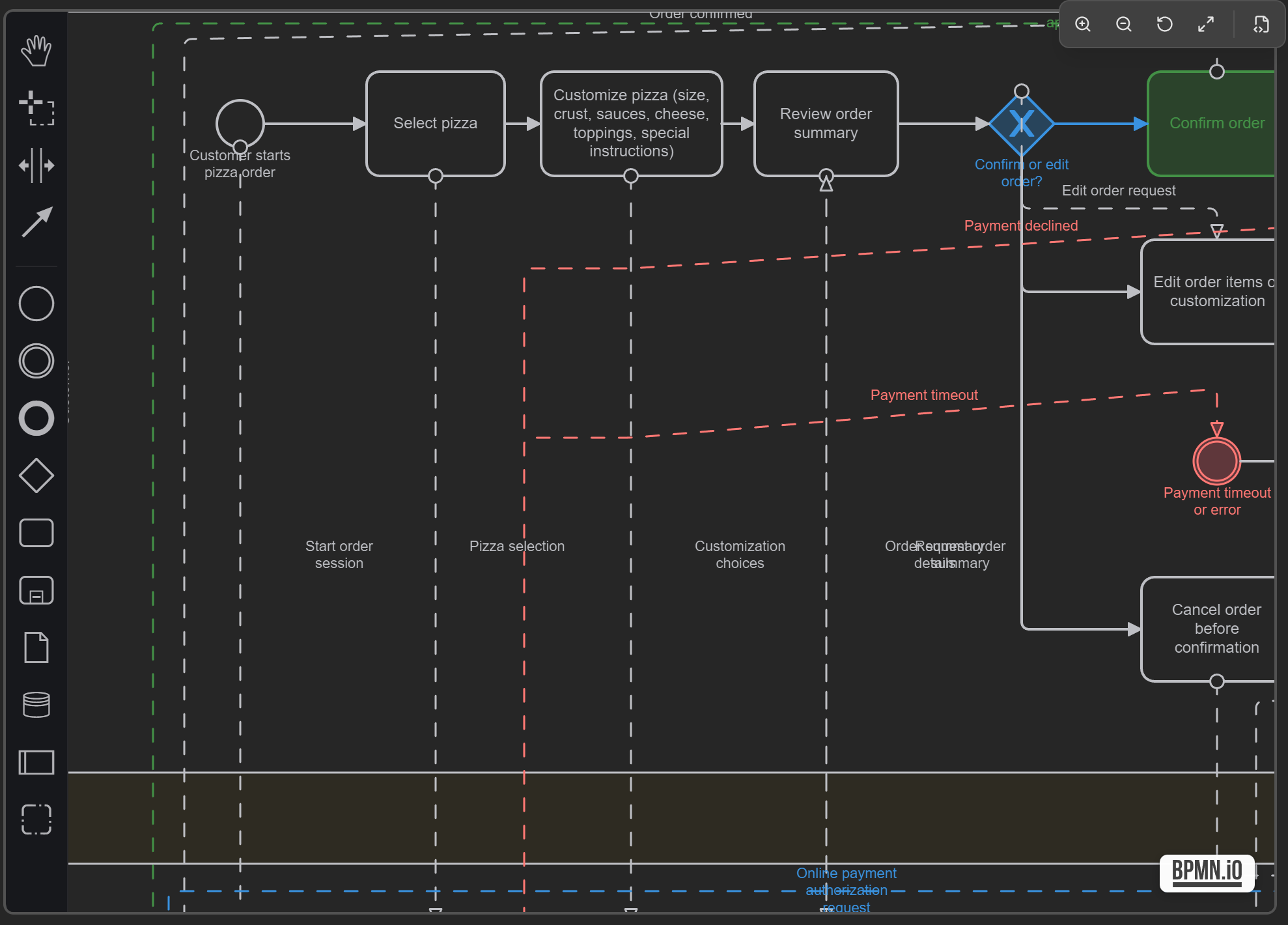 I am working on an app that shows bpmn diagrams in the editor using bpmn-js and have ensured the watermark is always visible and it is not disturbed by any background drawings etc. You can see it below. Have also made sure that in dark mode, the watermark is still visible by ensuring a white-ish background appears behind it to always make it visible.